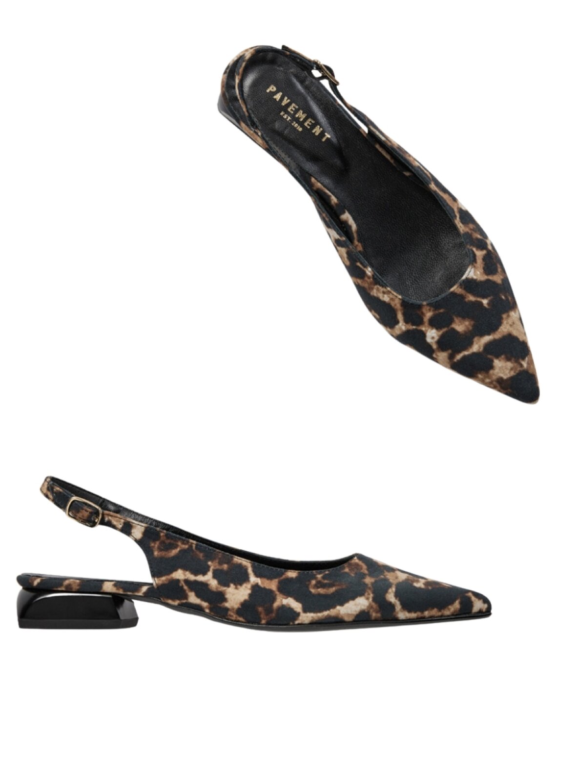 Smuk slingback sko fra Pavement i et flot eksklusivt look. Kala Slingback er designet i flot leopardprint med spids snude, en lille blokhæl og justerbar lukning på siden. Komfortable og bløde indersåler gør disse slingback sko yderst behagelige at have på.