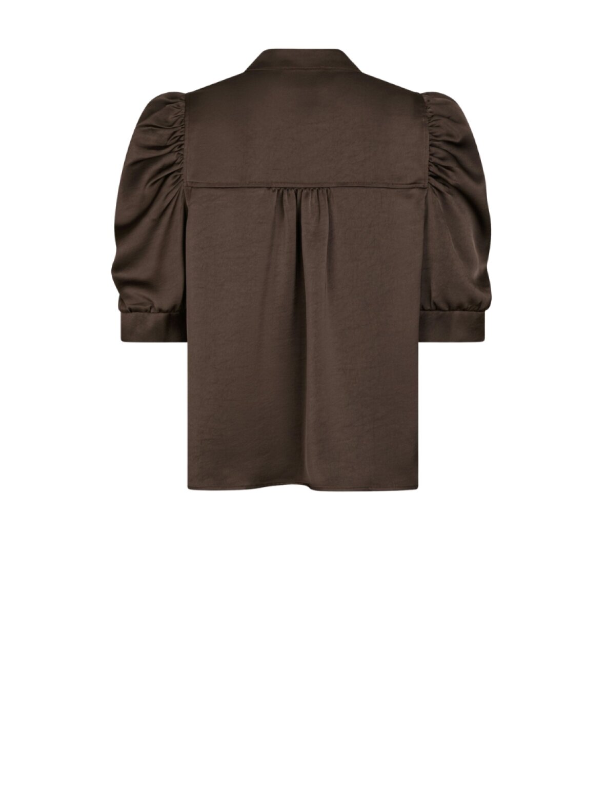 ❤︎ Smuk Neo Noir bluse i et flot satin look. Roella blusen har v-hals, elastik i de korte, smukke pufærmer og har en løstsiddende pasform.