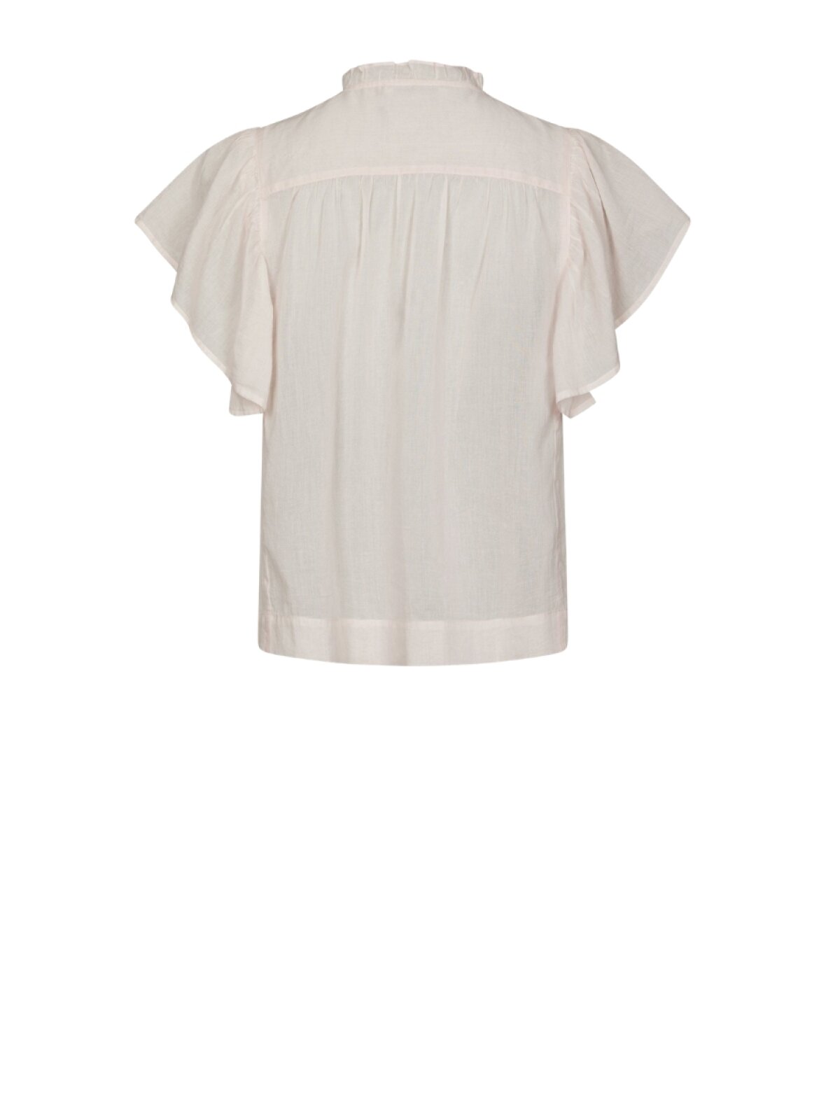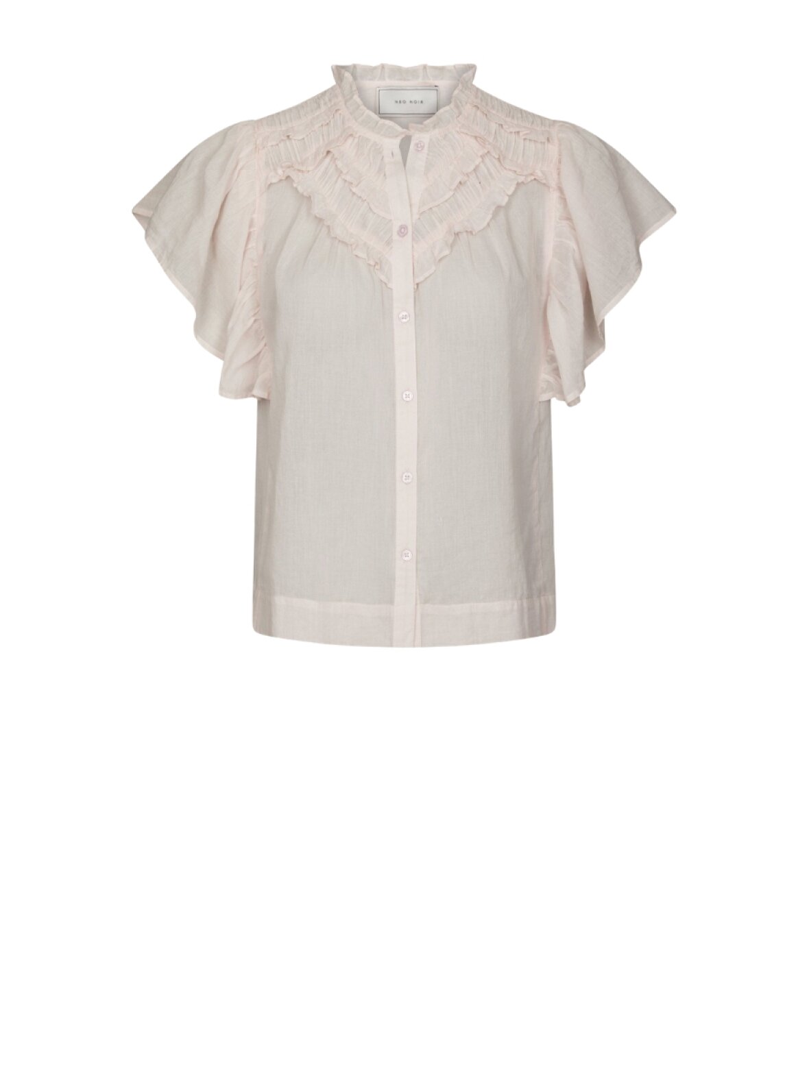 ❤︎ Den smukke Vinsa S Voile Top fra Neo Noir er designet med lille ærme, med flæser ved skuldrene og omkring halsen. Toppen er i en tynd bomuldskvalitet, har rund hals, en løs pasform og knaplukning foran.