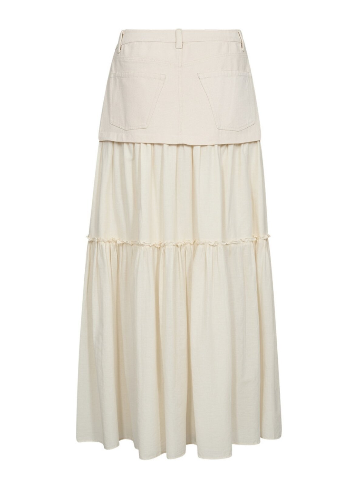 ❤︎ Angie Mix Long Skirt fra Ivy Copenhagen forener struktureret denim med en let, lagdelt maxinederdel, der falder smukt og bevæger sig elegant. Den har en tætsiddende pasform i talje og hofter, klassiske fem-lommers detaljer samt knap- og lynlåslukning med bæltestropper for et tidløst, men feminint udtryk.