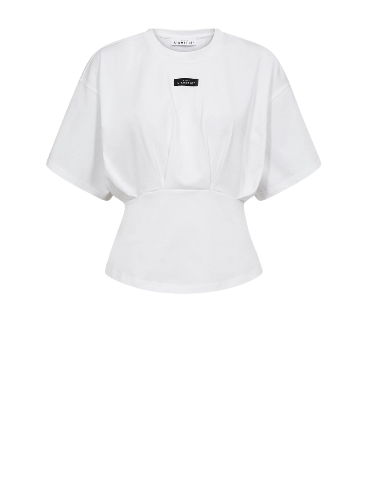 ❤︎ Super fin t-shirt fra Haute L'amitié i en kraftig bomuldskvalitet. Romie Pleat Tee er designet med et boxy, bredt fit øverst, henover de korte ærmer og har et flatterende indsnit i taljen, samt fine læg. Den lukkes med skjult lynlås i siden, har logo foran og en rund rib hals.