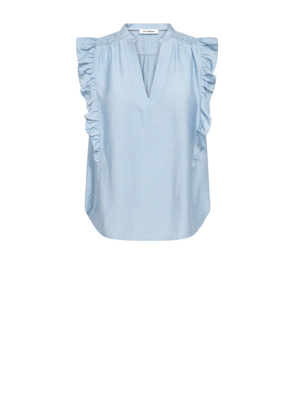 ❤︎ Skøn bluse fra Co'Couture med fine flæser ved skuldrene. HeraCC Frill SS V-toppen er designet med løstsiddende pasform og lavet i en lækker let kvalitet, som er super behagelig at have på. Smuk pyntet med smock elastik ved halsen, tilføjer et flot feminint touch.