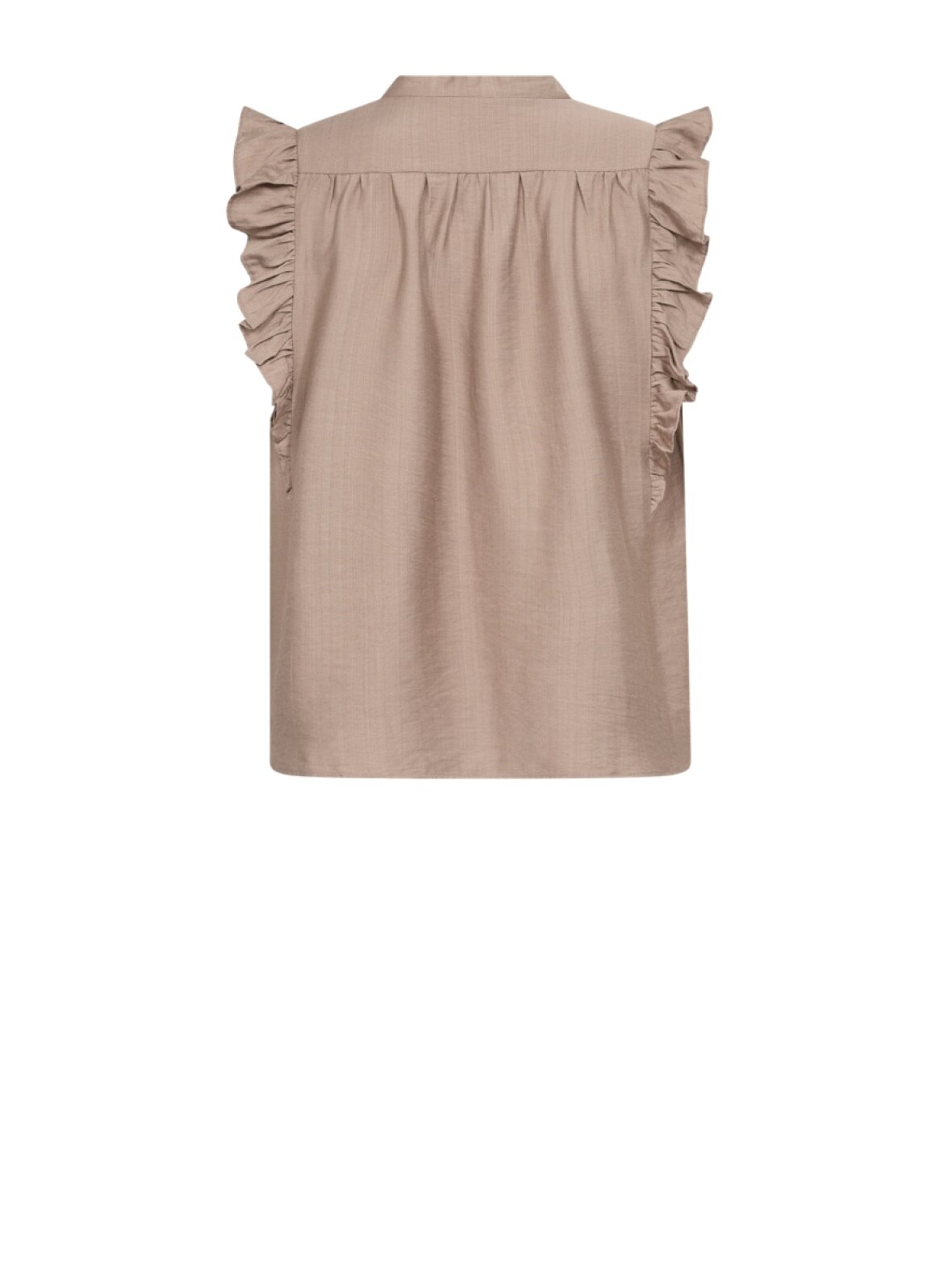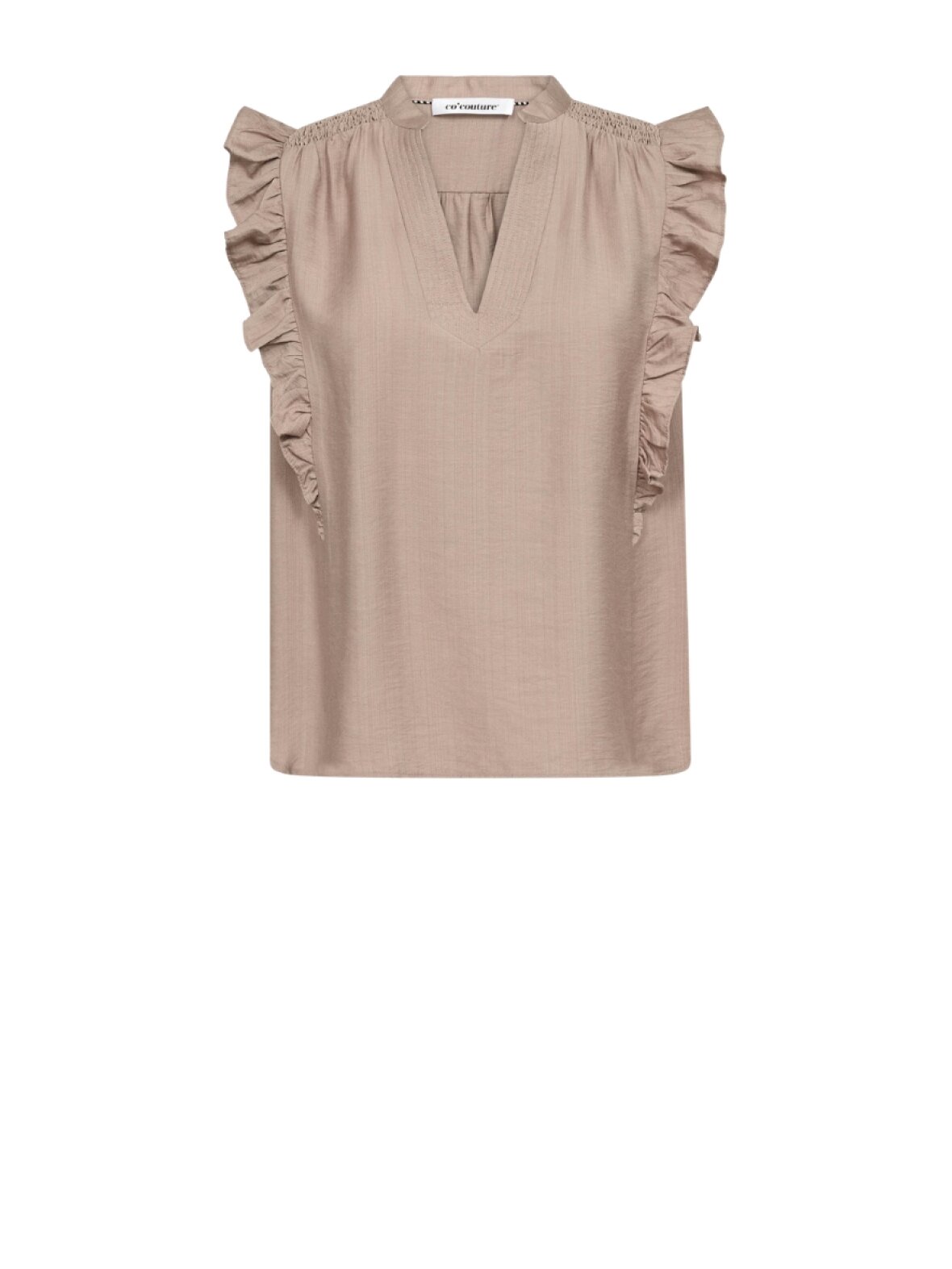 ❤︎ Skøn bluse fra Co'Couture med fine flæser ved skuldrene. HeraCC Frill SS V-toppen er designet med løstsiddende pasform og lavet i en lækker let kvalitet, som er super behagelig at have på. Smuk pyntet med smock elastik ved halsen, tilføjer et flot feminint touch.