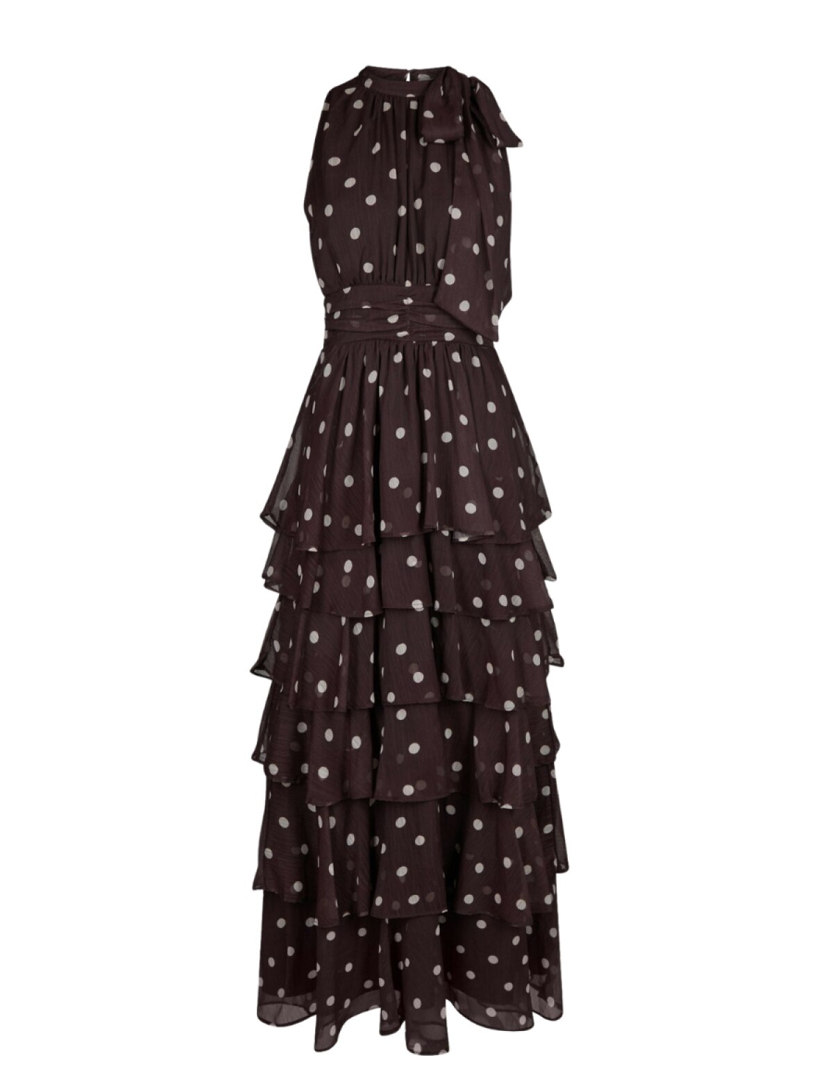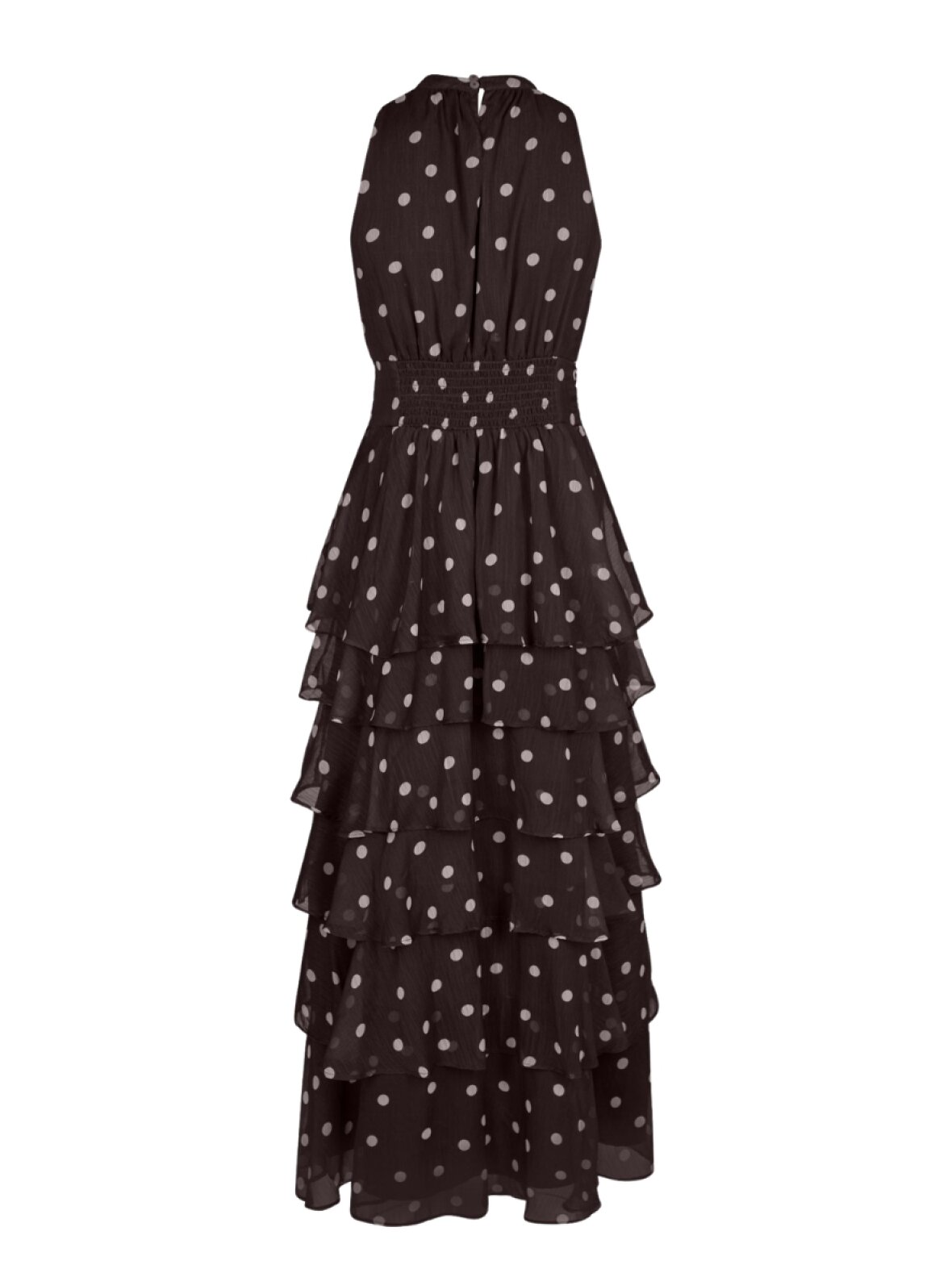 ❤︎ Elegant lang kjole fra Neo Noir i smuk chiffon kvalitet. Marli Big Dot kjolen er designet uden ærmer, med flæser hele vejen ned i skørtet og i en smuk brun farve med prikker. Kjolens semi høje hals lukkes i nakken med knapper og har en fin sløjfe detalje. Kjolen sidder pænt til i taljen, har smock elastik bagpå og indvendigt er fastsyet et under skørt.
