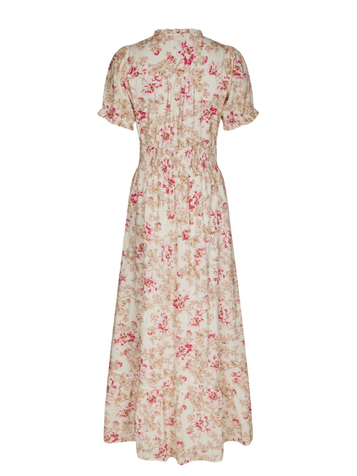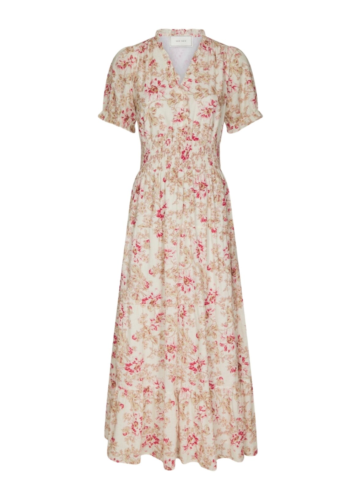 ❤︎ Smuk kjole i skøn, let bomuld fra Neo Noir. Den fine Kanza Flower Rose kjolen er en lang kjole med korte let puffede ærmer. Ved v-udskæringen er en fin flæse detalje og i taljen en bred smock, som tilføjer et flot og flatterende snit. Det lange skørt har en pæn a-form og indvendigt er et fastsyet et under skørt.
