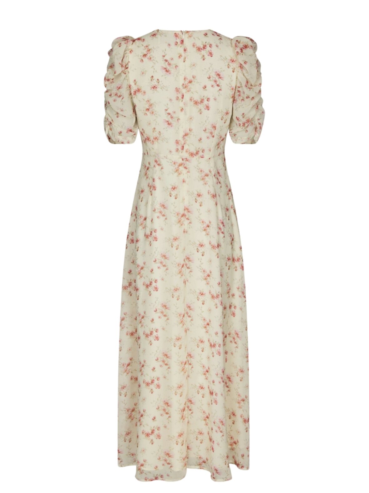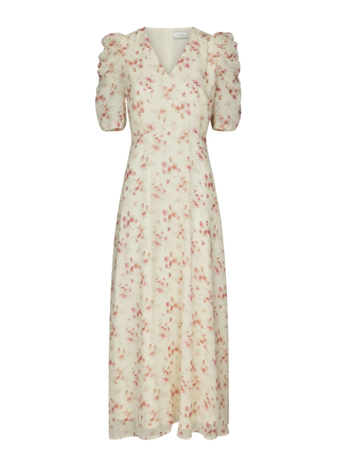 ❤︎ Skøn, lang kjole fra Neo Noir i et tyndt mesh lag, samt fastsyet underkjole. Vira Floral kjolen har korte pufærmer, v-udskæring og let vidde i skørtet. Den lukkes med lynlås i ryggen